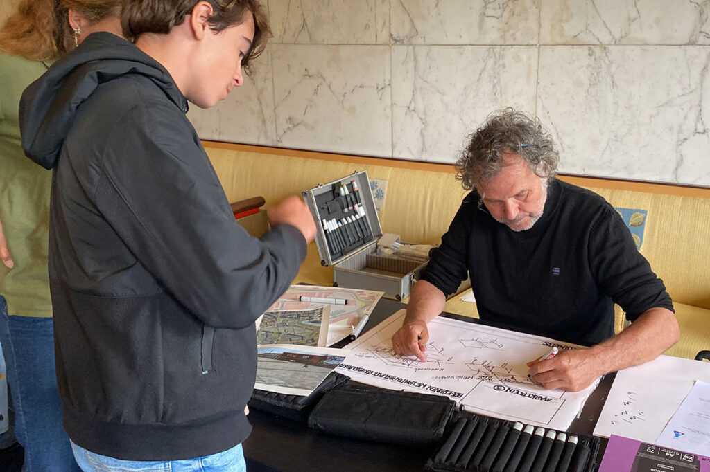 Over het martkplein van Hilversum wordt al jaren nagedacht. Hoe kunnen we de markt en evenementen laten doorgaan maar het plein ook meer vergroenen? De ideeën van de deelnemers werden verbeeld door Bert van der Meer, zoals  een rijdende overkapping met groen dak.