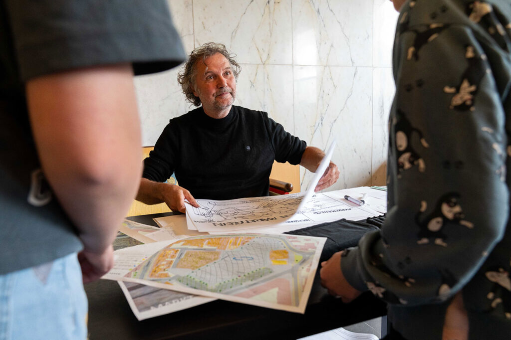 Bert van der Meer tekende ook de ontwerpen die de leerlingen bedachten voor een ideaal studentenhuis, want Hilversum moet ook bouwen voor jongeren. Alle tips, zoals gezamenlijke ruimtes, een bord waarop iedereen taken kan opschrijven (“liever niet in een app, want dat ben je zo weer kwijt”) kwamen terecht in de tekening. De gemeente kan ze zo gebruiken in hun ontwerpenplannen: